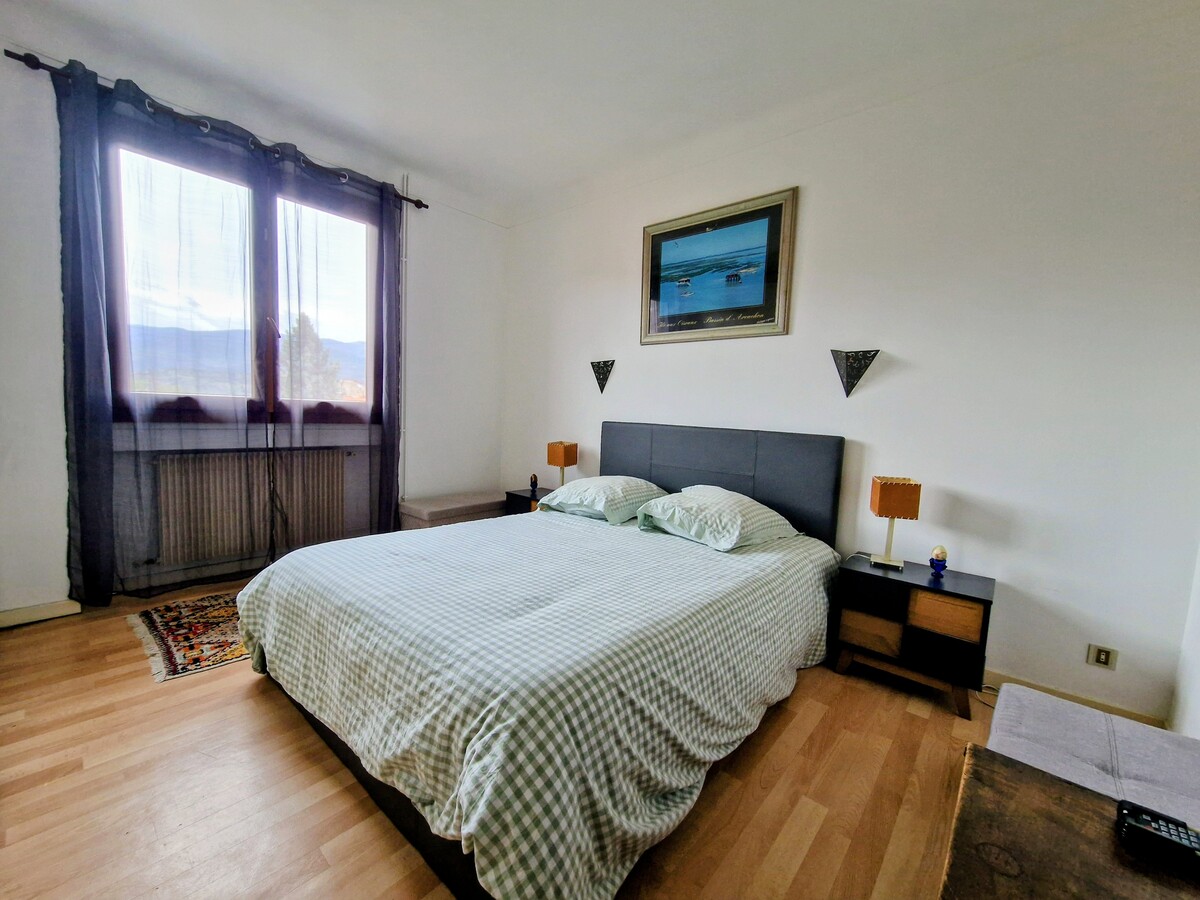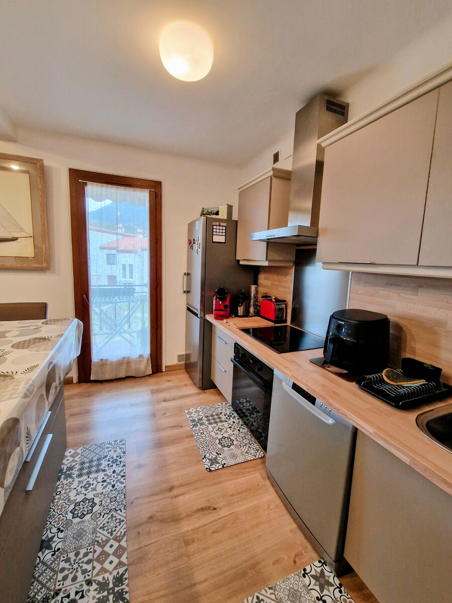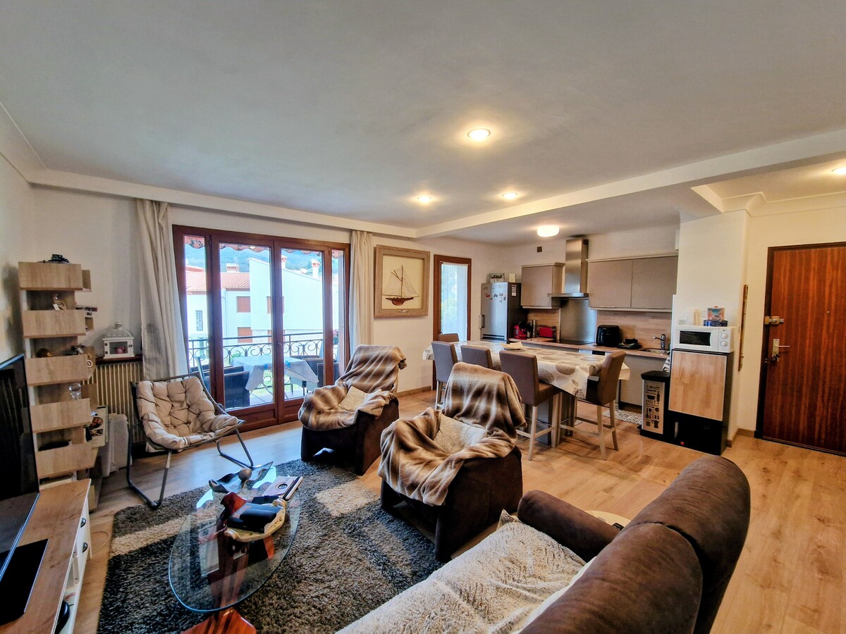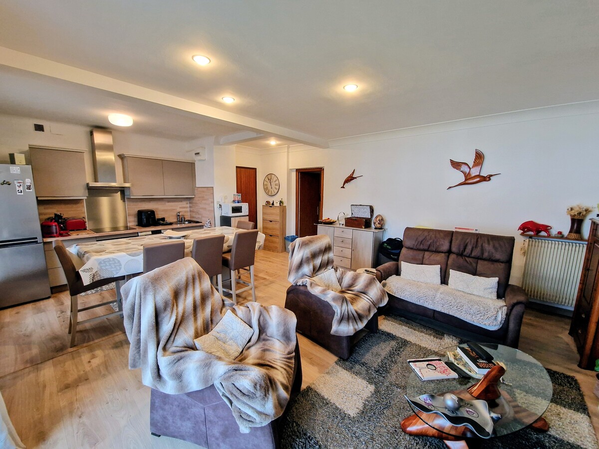 L'appartement est composé d'une pièce de vie ouverte sur la cuisine (rénovée) d'une surface de 31.50m² donnant accès au balcon (9m²) très ensoleillé et agréable avec une vue dégagé sur le Canigou puis accès à la partie "nuit" avec les 2 chambres (12.60m² & 12.75m²) , wc séparé, salle d'eau rénové.