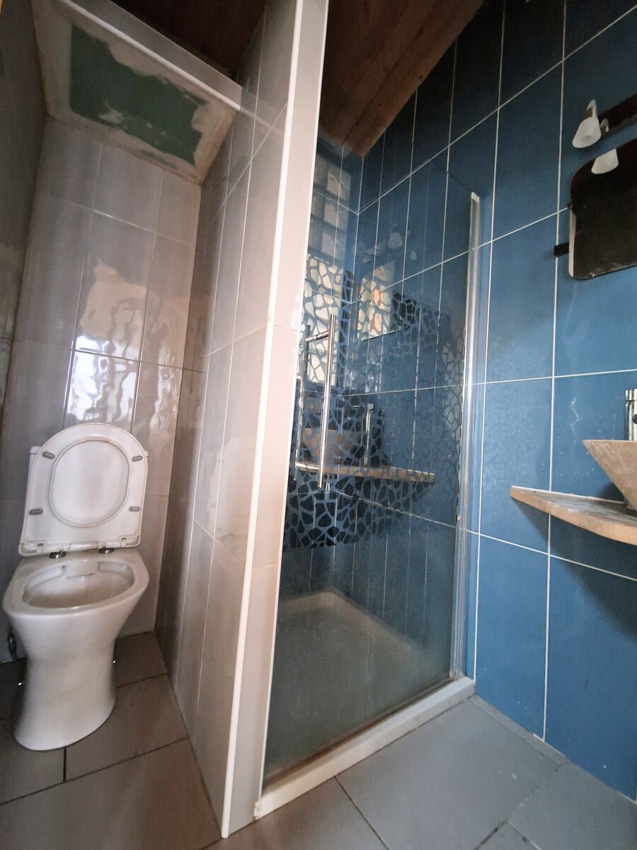 La maison (env. 65m² surface habitable): pièce de vie ouverte sur la cuisine donnant accès à la cour extérieur puis au garage, wc . Au 1er étage, 2 chambres avec placard, salle de bain et wc séparé